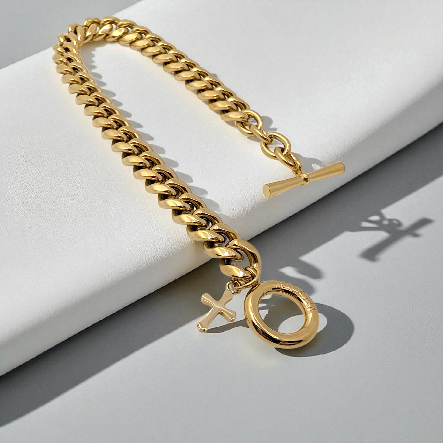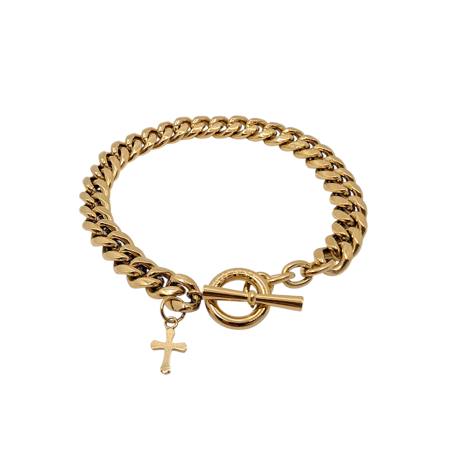 Esta pulsera de cadena con eslabones de 8 mm y detalle en forma de cruz combina diseño y resistencia en una pieza única. Elaborada en acero inoxidable con un baño de oro de 18 quilates, ofrece una durabilidad excepcional y un brillo elegante que perdura con el uso diario. Su estructura robusta garantiza resistencia al desgaste, mientras que el detalle cruz aporta un toque distintivo y sofisticado, ideal para cualquier ocasión, esta pulsera fusiona estilo y calidad en un diseño atemporal que realza cualquier conjunto.