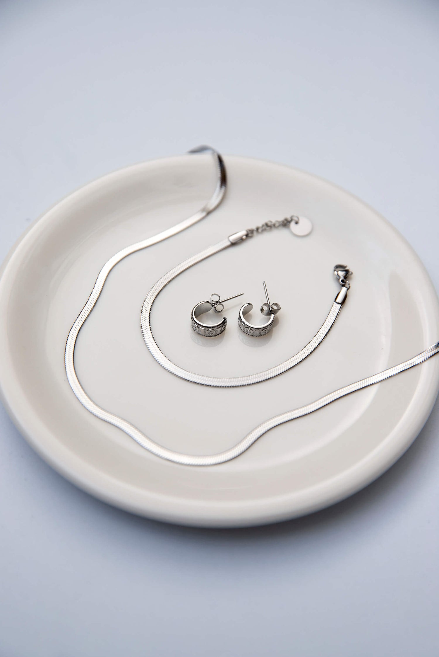 Adorn yourself with Ailana Snake Bracelet, crafted with an etched herringbone design. This bracelet will make a chic, modern statement. Also available in gold color. Pair it with Maia necklace to complete the look!