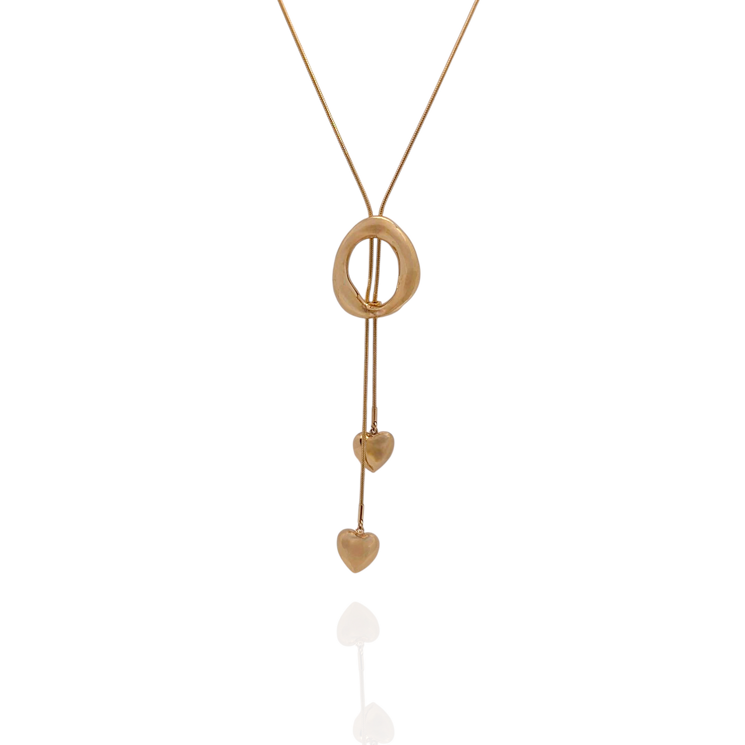 Colgante Paola con dos corazones delicadamente entrelazados, diseñado para expresar conexiones profundas y sentimientos duales. Un accesorio versátil que complementa tanto looks cotidianos como ocasiones especiales, reflejando sensibilidad y buen gusto.