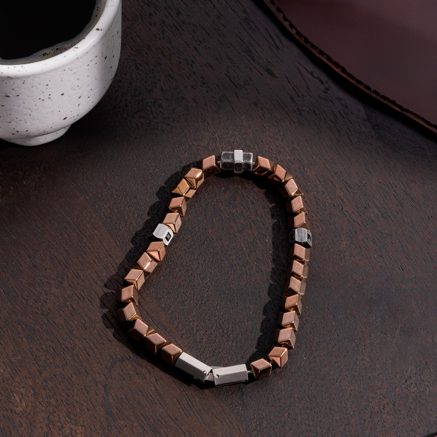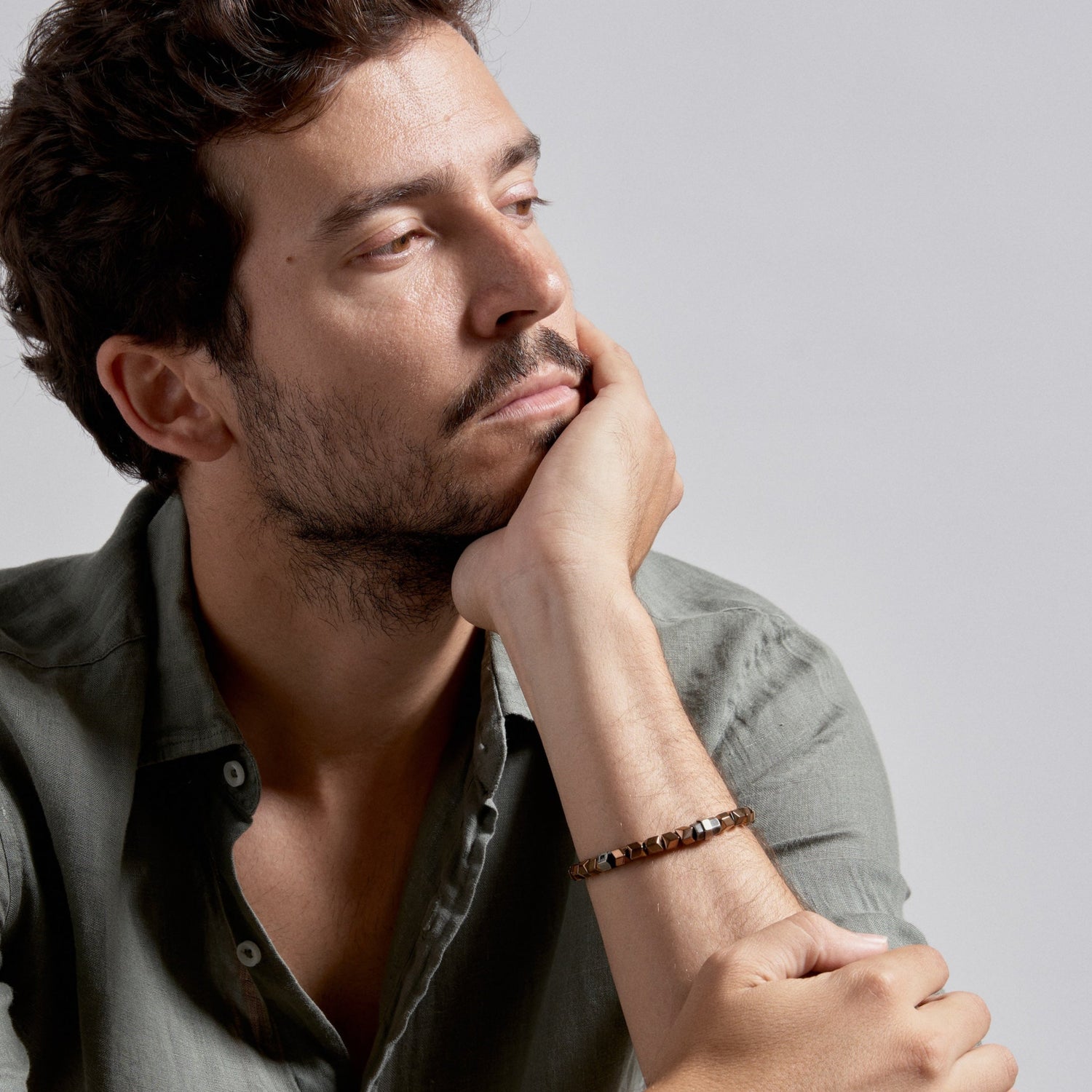 El brazalete Hematite destaca por su estructura en hilo de acero resistente, complementada con piedras naturales de hematita que aportan un acabado sofisticado y moderno. Esta combinación ofrece una pieza duradera y elegante, perfecta para quienes valoran la calidad y el diseño contemporáneo en sus accesorios.