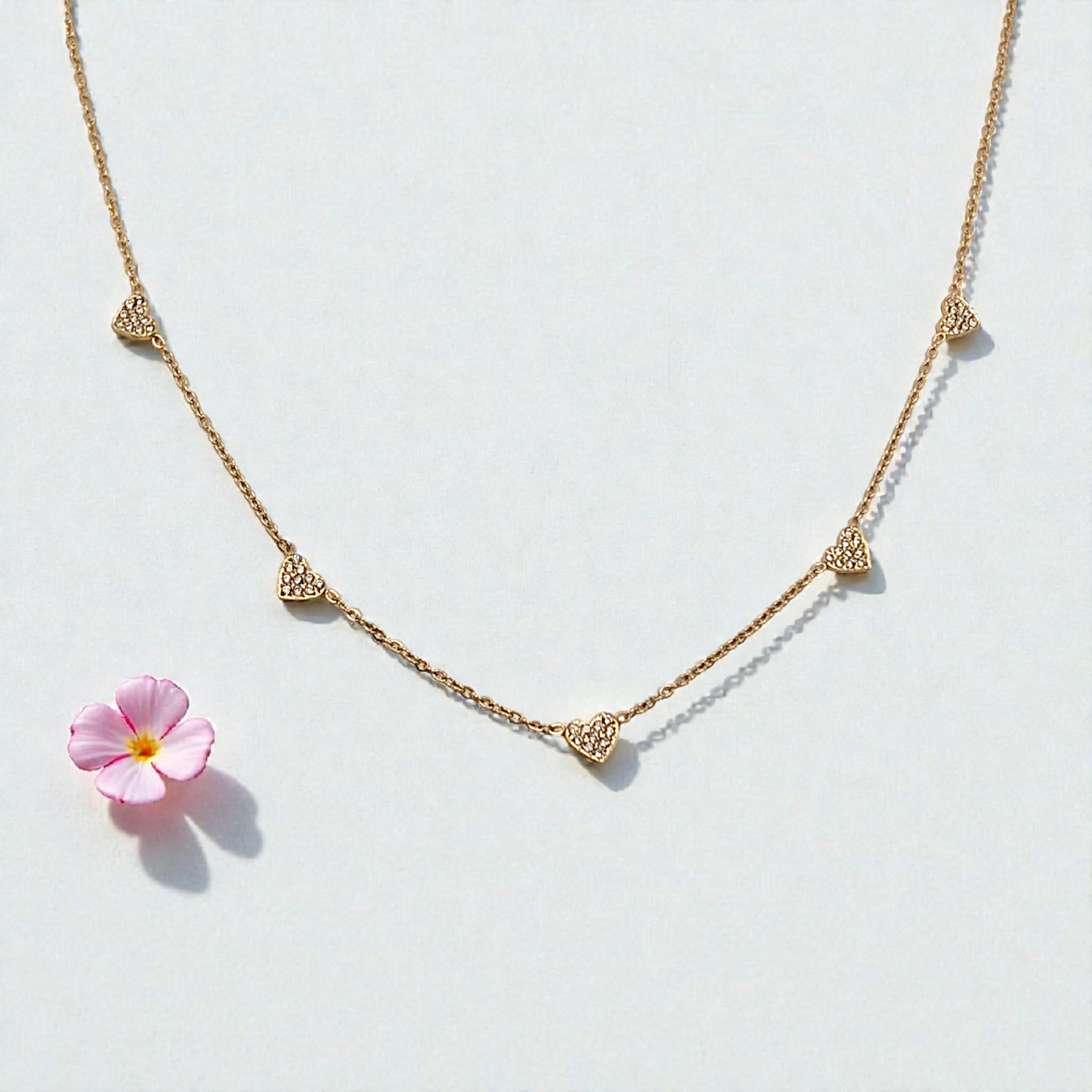 Colgante choker minimalista con corazones en acero inoxidable chapado en oro. La gargantilla se ajusta perfectamente al cuello, creando un efecto sofisticado ideal para uso diario o eventos especiales. Resistente al agua y duradero, mantiene su brillo dorado sin oxidación. Pieza versátil que complementa cualquier estilo, desde casual hasta formal.